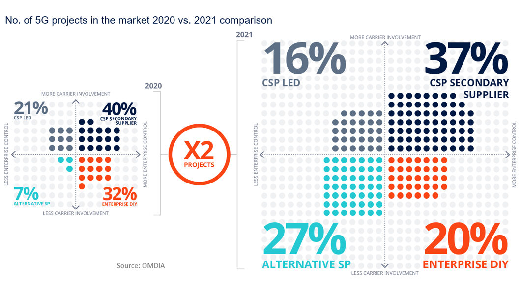This conclusion was evident in our 2020 5G market analysis, Industries and Enterprises are ready to reap the benefits of 5G, which we developed in collaboration with analyst firm Omdia. However, despite all parties coming to the same conclusion, it was clear that Communications Service Providers (CSPs) have yet to buy into that same theory. In fact, what’s worrying is that out of all 5G enterprise deals to date, only one in five early enterprise 5G deals was CSP-led, proving that the way CSPs wanted to sell was at odds with the way in which businesses wanted to buy. This year, we collaborated again with the Omdia team to review the situation a year on…
